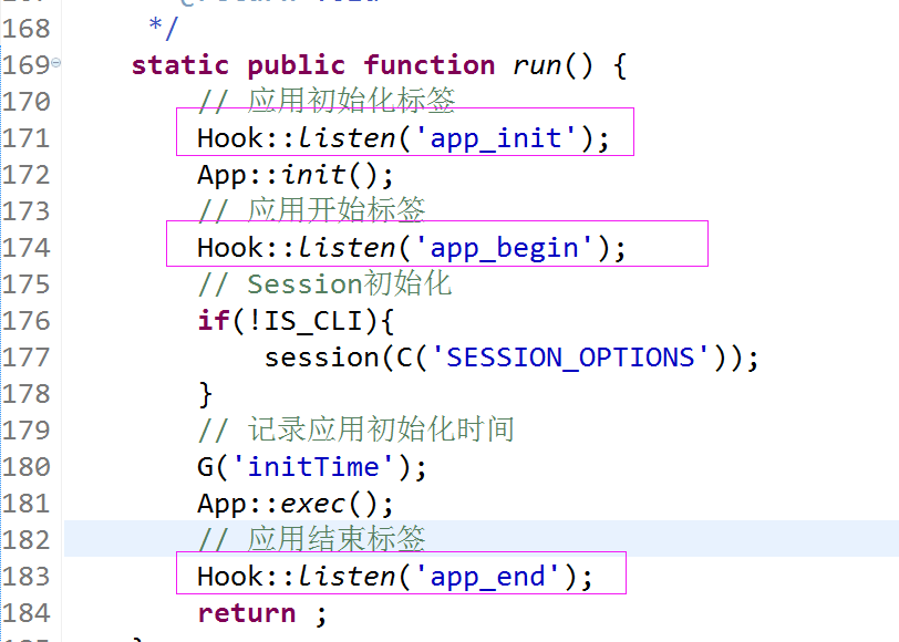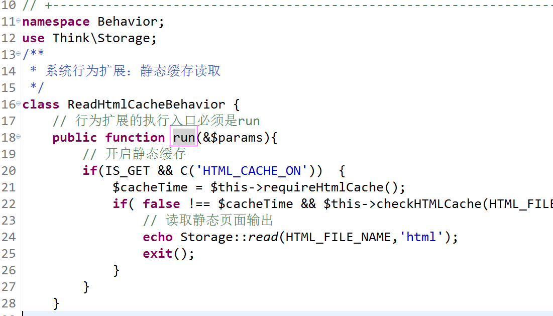 如Hook::listen('app_begin')相当于调用Behavior\ReadHtmlCache中的run方法。找到该类,可以查看其对应的run方法如下