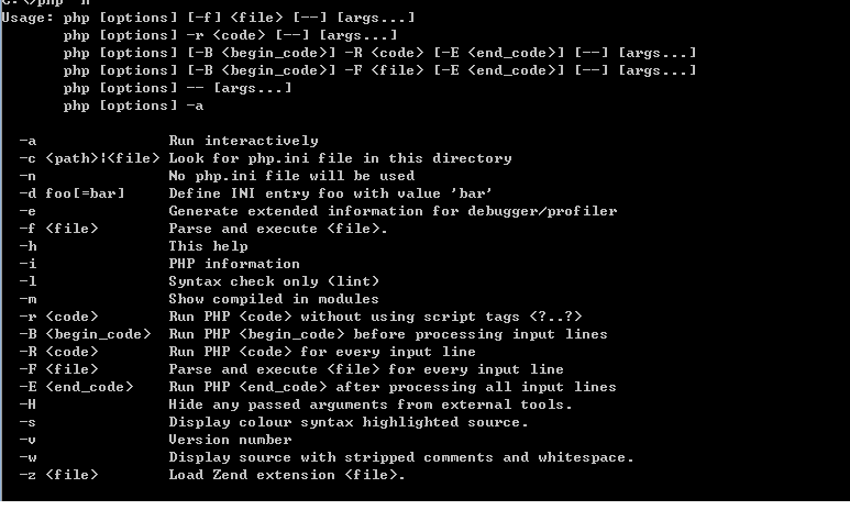 Usage: php [options] [-f] <file> [args...] php [options] -r <code> [args...] php [options] [-- args...] -s Display colour syntax highlighted source. -w Display source with stripped comments and whitespace. -f <file> Parse <file>. -v Version number -c <path>|<file> Look for php.ini file in this directory -a Run interactively -d foo[=bar] Define INI entry foo with value 'bar' -e Generate extended information for debugger/profiler -z <file> Load Zend extension <file>. -l Syntax check only (lint) -m Show compiled in modules -i PHP information -r <code> Run PHP <code> without using script tags <?..?> -h This help args... Arguments passed to script. Use -- args when first argument starts with - or script is read from stdin |