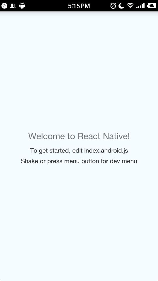 摇晃设备或按Menu键(Bluestacks模拟器按键盘上的菜单键,通常在右Ctrl的左边 或者左Windows键旁边),可以打开调试菜单,点击Dev Settings,选Debug server host for device,输入你的局域网IP,再按back键返回,再按Menu键,在调试菜单中选择Reload JS,就应该可以看到运行的结果了。